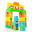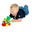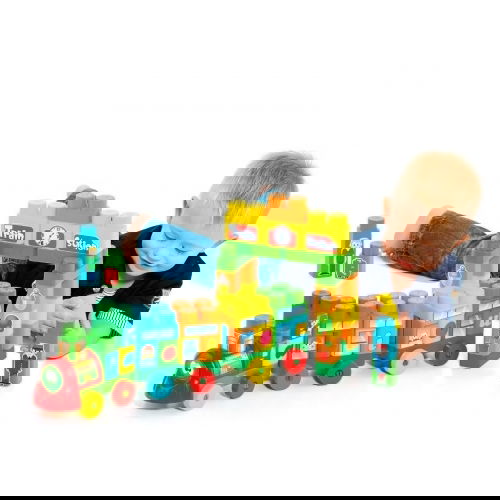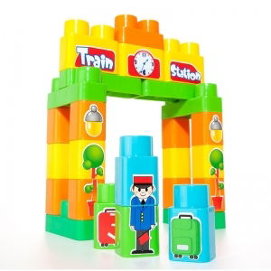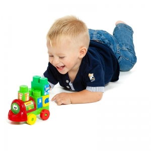 Completo set de Moltó con locomotora, 2 vagones, distintos tipos de piezas para montar la estación y stickers para decorar los ambientes y caracterizar los personajes.