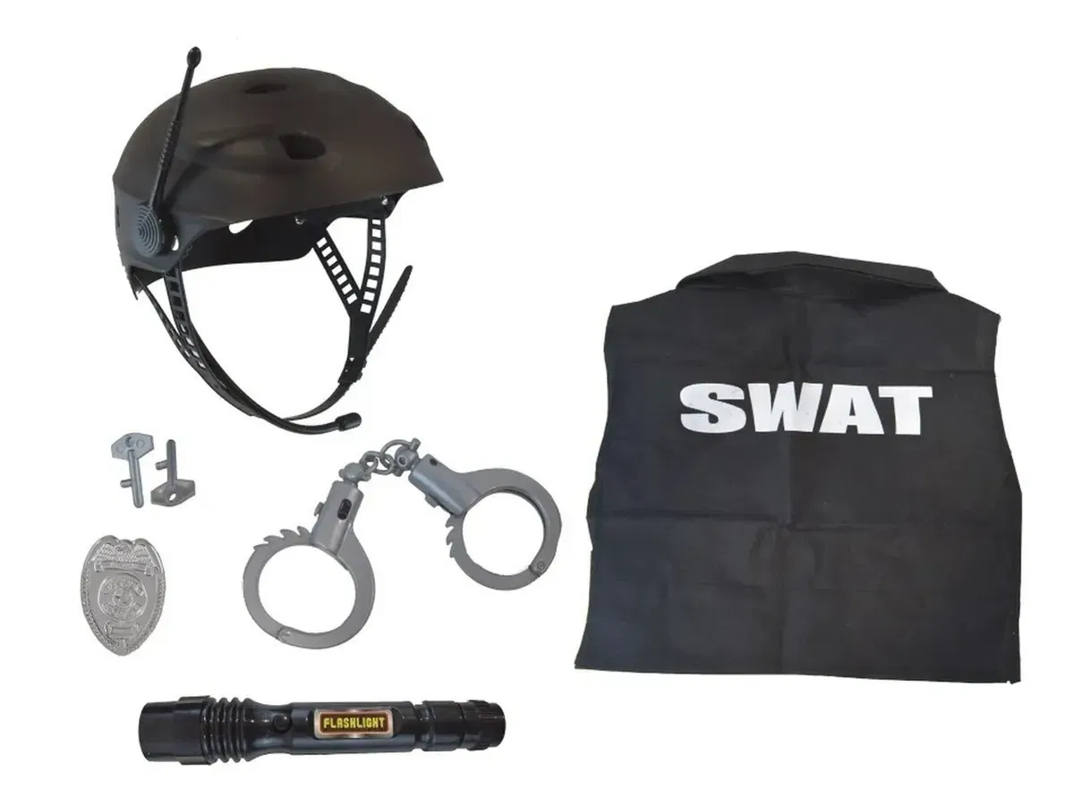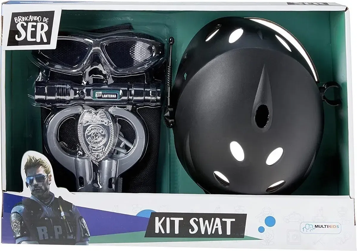 Tu juego será mucho más divertido con el Kit Swat, ¡cuenta con varios accesorios para que tu juego sea mucho más divertido y completo! ¡Usa tu imaginación y participa en un gran evento con tu Kit Brincando de Ser! Conviértete en un héroe y cumple tu sueño de ser un gran policía especial. 1 casco con antena, 1 gafas, 1 esposas, 1 linterna, 1 chaleco, 1 par de llaves Medidas aproximadas del chaleco: 31 cm x 27 cm Medidas aproximadas del casco por dentro: 20 cm x 15 cm 3 baterías LR44 (incluidas) A partir de 3 años en adelante