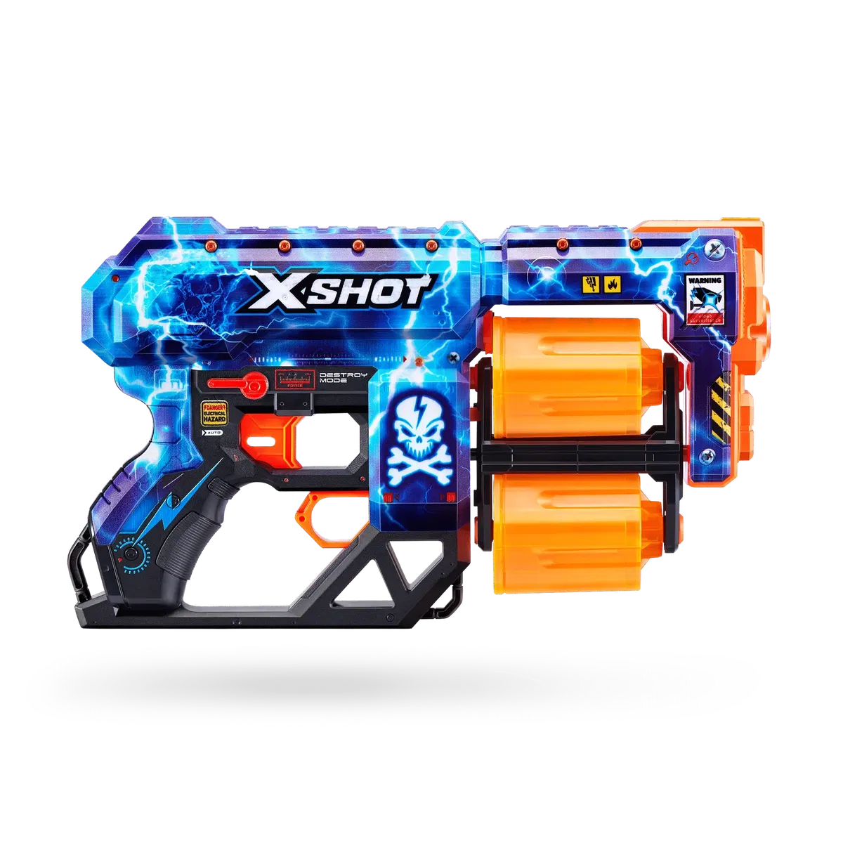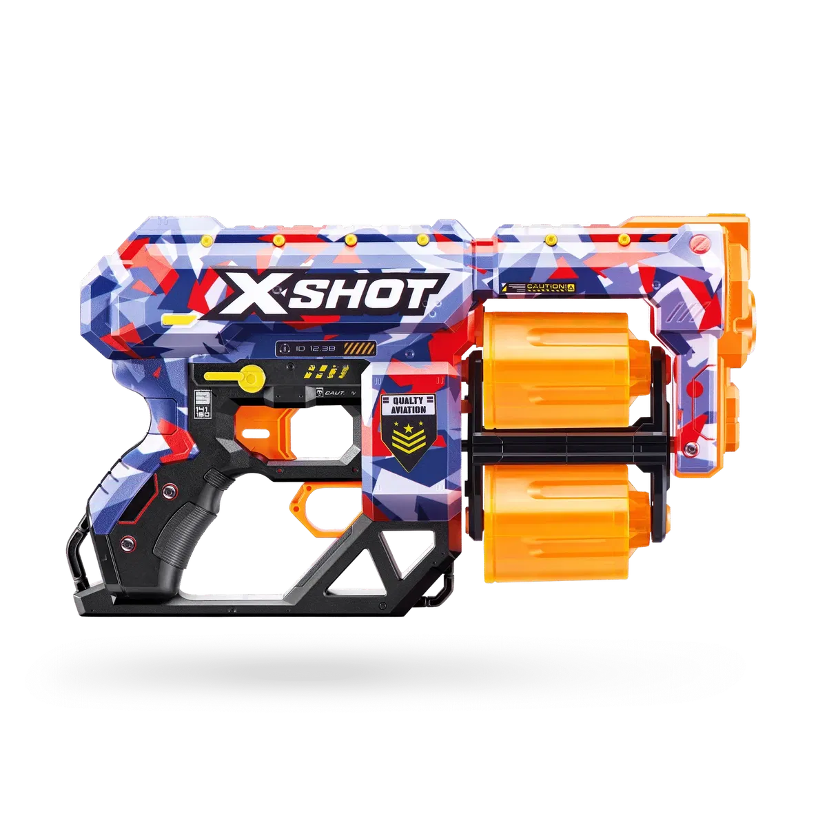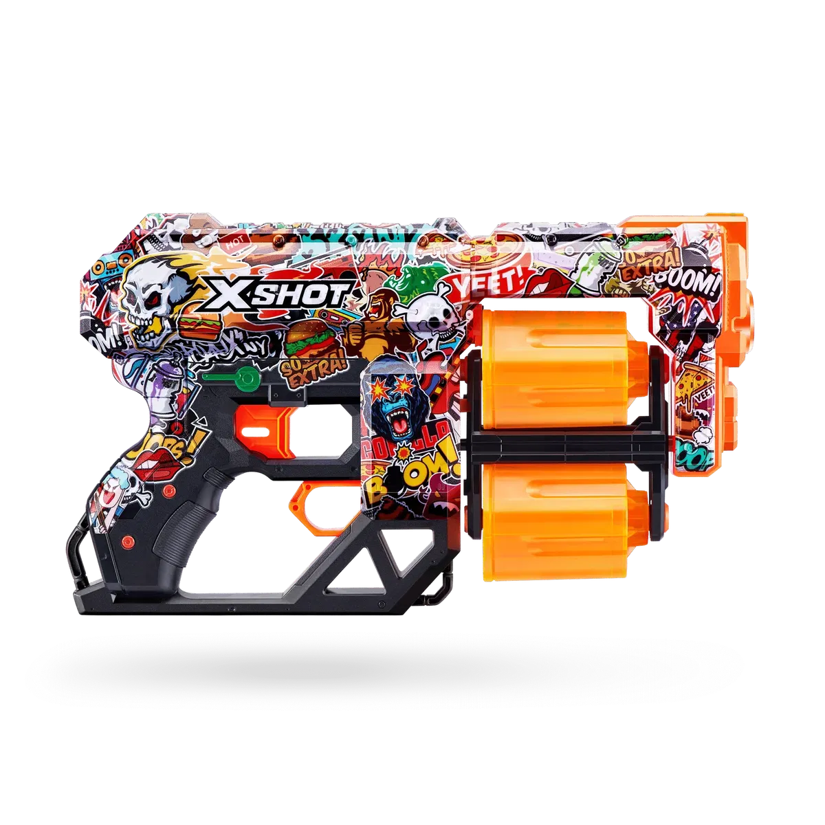 XSHOT Skins lleva al mundo real la experiencia de tunear tu blaster. Elige tu Skin y únete a la batalla. Con una capacidad de 12 dardos, el doble cañón giratorio de la Dread significa que estás preparado para la diversión. Cuando te quedes sin dardos en un cañón, cambia al segundo y dispara a la competencia desde una distancia de hasta 27 metros. El lanzadardos XSHOT Skins Dread viene en 7 diseños únicos para elegir, coleccionar, y para construir tu arsenal definitivo. Elige diferente, elige XSHOT Skins.