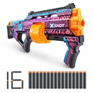 XSHOT Skins lleva al mundo real la experiencia de tunear tu blaster. Elige tu Skin y únete a la batalla. El XSHOT Skins Last Stand es la pistola más grande de la gama Skins, y combina una potencia de fuego épica, velocidad de acción y precisión en una sola pistola. Con un cañón autogiratorio con capacidad para 14 dardos, puedes acertar a varios objetivos a una distancia de hasta 27 metros. Libera 14 dardos en segundos gracias a su mecanismo de fácil preparación. La pistola XSHOT Skins Last Stand viene en 4 diseños únicos para elegir y coleccionar. Elige diferente, elige XSHOT Skins.