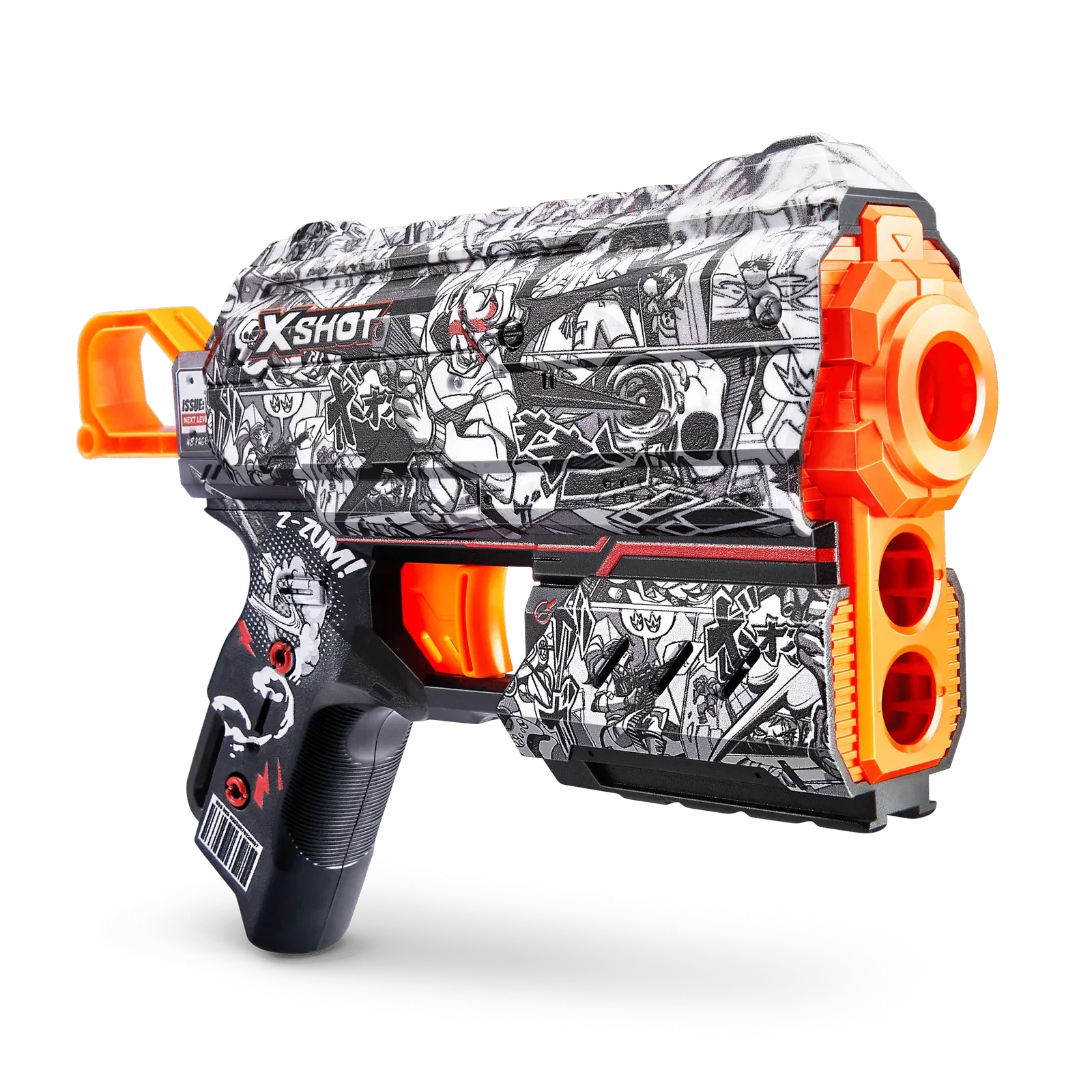 XSHOT Skins lleva al mundo real la experiencia de tunear tu blaster. Elige tu Skin y únete a la batalla. Salta directamente a la acción con la pistola lanza dardos de XSHOT Skins Flux con una capacidad de disparo de un dardo y 2 dardos de almacenamiento frontal. El Flux puede alcanzar objetivos a una distancia de hasta 27 metros y viene en 6 diseños únicos para seleccionar, coleccionar y para construir tu arsenal definitivo. Elige diferente, elige XSHOT Skins.