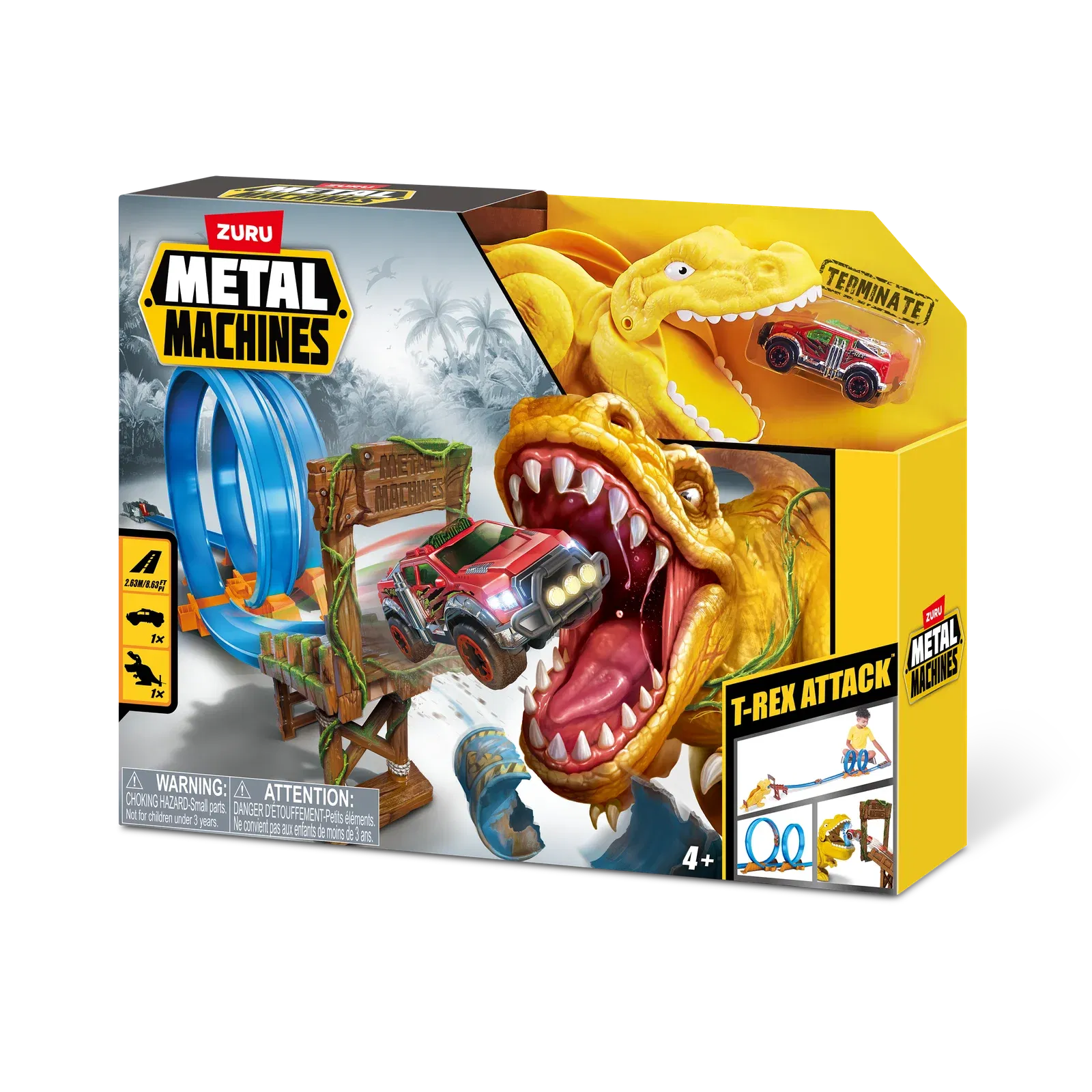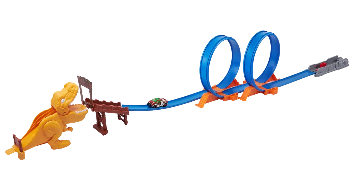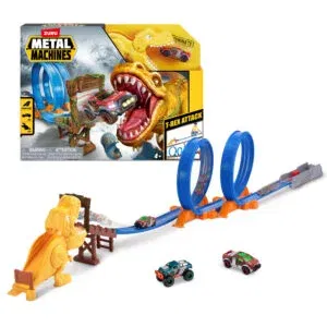 Metal Machines Rex Attack Pista ¡Lanza tu Wild Thing furiosamente con el poderoso lanzador Metal Machine y derriba al T-Rex que ha estado aterrorizando a la región! ¿Puedes generar suficiente potencia para pasar los bucles dobles de 360 grados y atravesar al T-Rex, derribándolo, o te convertirás en comida de dinosaurio? METAL MACHINES T-REX PLAYSET: ¡Lanza tu Wild Thing furiosamente con el poderoso lanzador Metal Machine y derriba al T-Rex que ha estado aterrorizando a la región! Las máquinas de metal T-Rex Attack vienen con una máquina de metal exclusiva: ¡Wild Thing! METAL MACHINES T-REX PLAYSET: ¡Lanza tu Wild Thing furiosamente con el poderoso lanzador Metal Machine y derriba al T-Rex que ha estado aterrorizando a la región! ¡Lanza tu Metal Machine a través de más de 2 metros de pista en su camino para derribar al Dino al final de la pista! ACCIÓN DE DOBLE BUCLE: ¿Puedes generar suficiente potencia para acelerar a través de los bucles dobles de 360 y atravesar directamente el T-Rex? INCLUYE: 1 x Lanzador potente, 1 x Pista de carreras que incluye dos 360-Loops, Stunt Ramp, 1 x T-Rex Edad 3+.