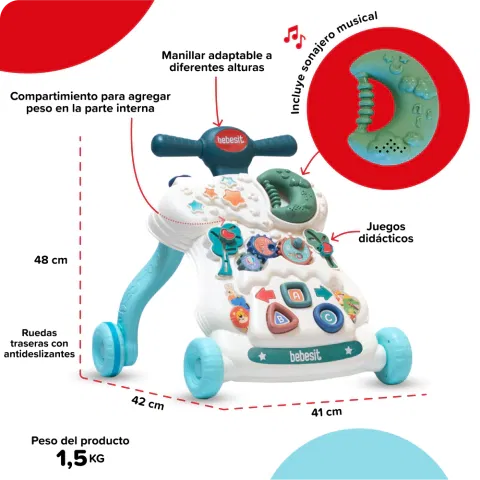 El Caminador Bebesit con música y panel didáctico es el compañero perfecto para los primeros pasos. Estimula la coordinación, el equilibrio y el desarrollo motriz del bebé mientras se divierte explorando sonidos, formas y colores.