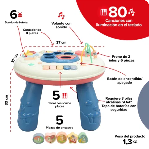 Incluye: Mesa didáctica desarmada + 5 piezas de encastre, manual de armado.