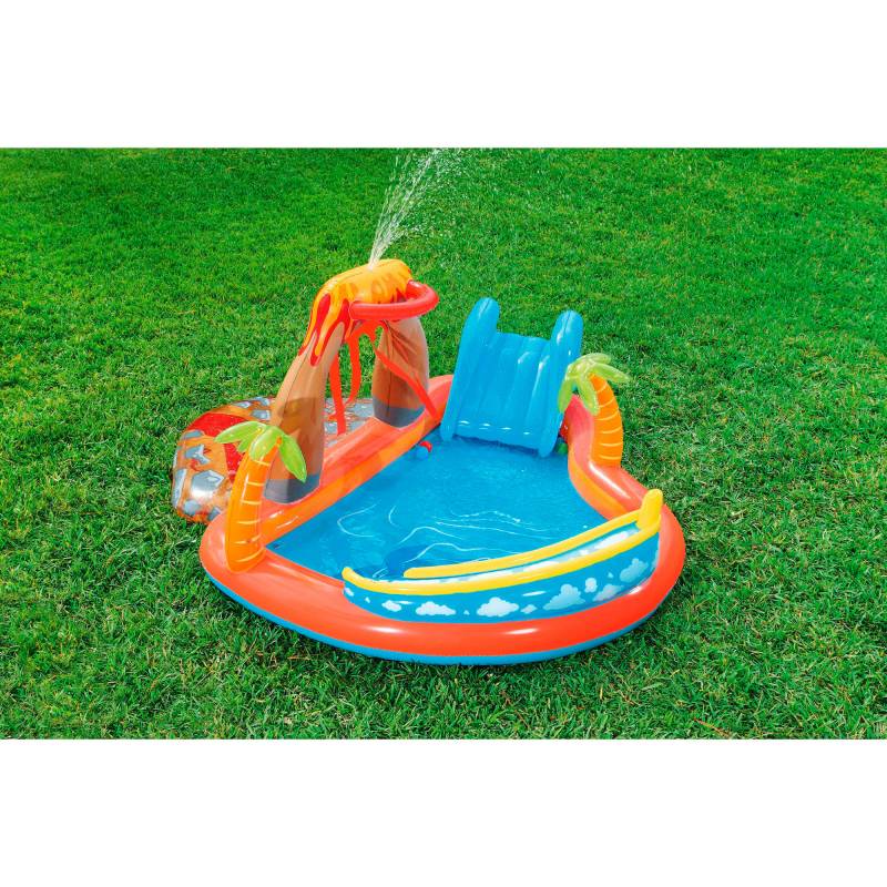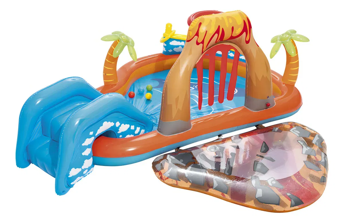 El centro de juegos Bestway® Lava Lagoon™ es el oasis de diversión en el jardín con el que sueñan tus hijos. Está diseñado para un máximo de 4 niños mayores de 2 años y cuenta con un colorido volcán que pulveriza agua. Este se conecta a una manguera de jardín para mantener el frescor mientras los niños juegan. Incluye 4 pelotas para subir y bajar por la rampa hinchable y 1 aro hinchable para jugar a lanzar aros. También incluye un tobogán desmontable con cuerdas de sujeción y ojales, y un blobz blandito desmontable relleno de agua para jugar o tumbarse. Además, el suelo hinchable acolchado de la piscina proporciona comodidad adicional a los más pequeños y, con las palmeras hinchables que cubren el exterior de la piscina, ¡tu hijo se sentirá como en otro mundo! Cuando terminéis de jugar en el centro de juegos, vacía el agua de la piscina con la válvula de drenaje fácil de usar y dóblala para usarla en el futuro. Con espacio suficiente para los amigos, chapotear bajo el sol nunca ha sido tan divertido como con el centro de juegos Lava Lagoon.