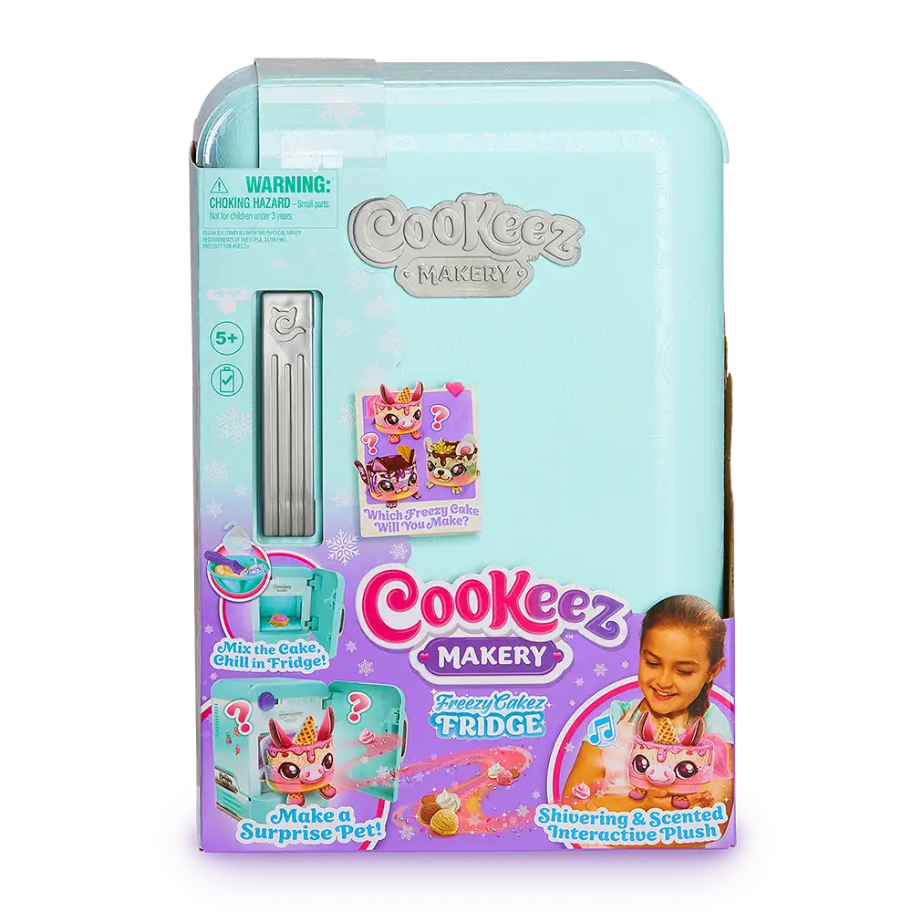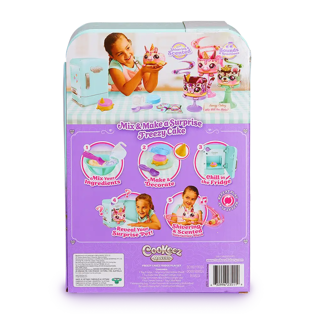 Cookeez Makery Freezy Cakez Refrigerador transforma la diversión de la cocina de juguete para niños en una experiencia sorprendente y mágica. Los chicos preparan la mezcla, la colocan en el freezer del refrigerador y descubren un juguete de peluche perfumado que tiembla como si estuviera helado.