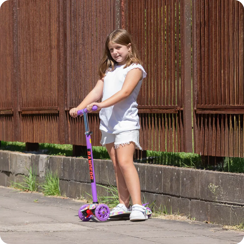 El Scooter Randers es ideal para niños que están aprendiendo a manejar, ya que su diseño de tres ruedas y freno trasero lo hace seguro y fácil de usar. Incluye luces en las ruedas, estructura liviana y sistema plegable para guardado cómodo.