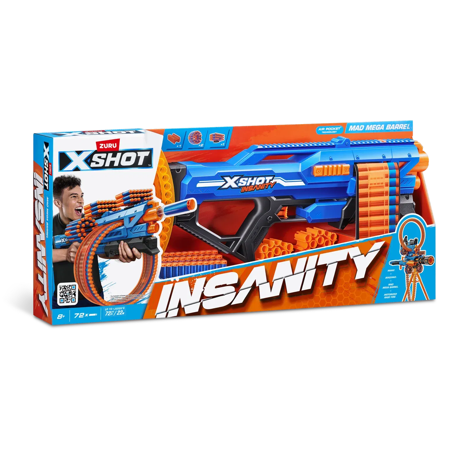 Pistola XSHOT Insanity Mad Mega de ZURU con 72 dardos, dardos con tecnología air pocket y almacenamiento para dardos, cañón giratorio con una gran capacidad para dardos, juguete de exterior para niños y niñas, adolescentes y adultos.