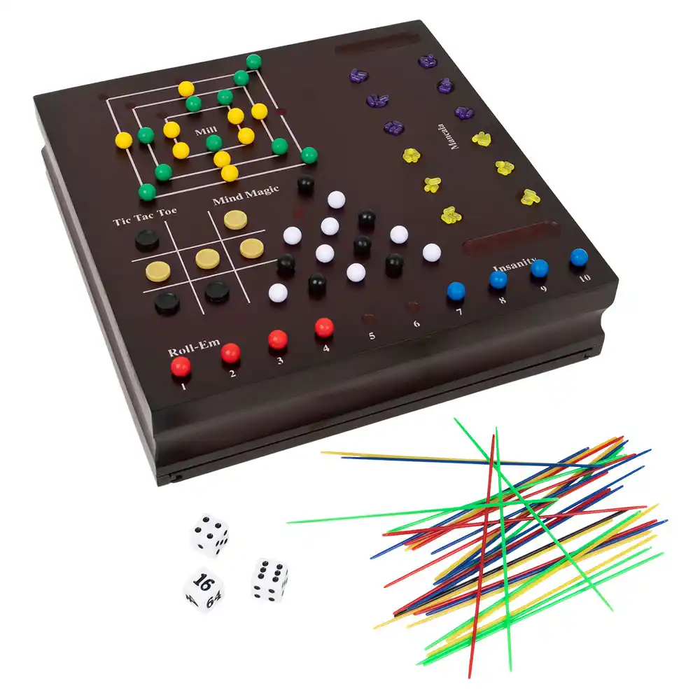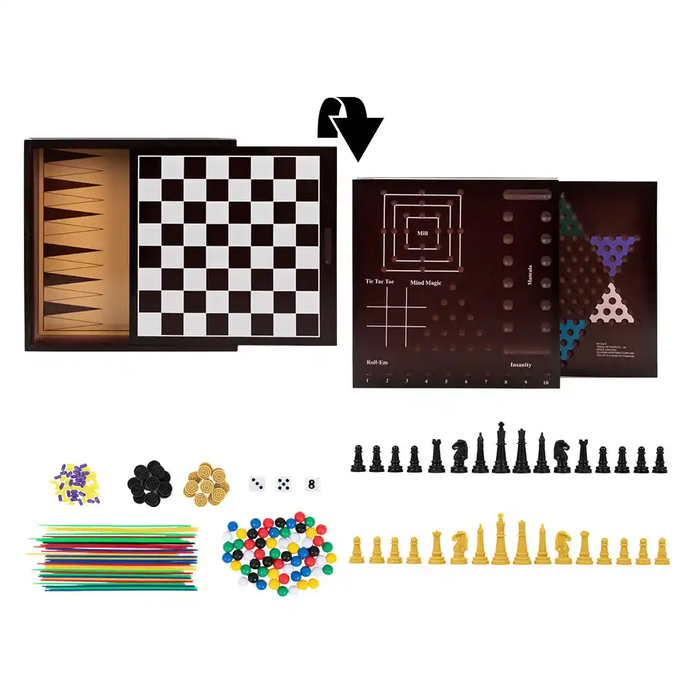 El juego de 10 juegos de lujo de Spin Master Games ofrece una selección de clásicos que atraviesan generaciones. Presentado en una elegante caja de madera, este set incluye ajedrez, damas, backgammon, máncala, damas chinas, gato y otras propuestas tradicionales para compartir momentos únicos. Su diseño práctico y duradero lo convierte en una excelente opción para disfrutar en familia, fomentar el pensamiento estratégico y revivir juegos atemporales con una estética cuidada.