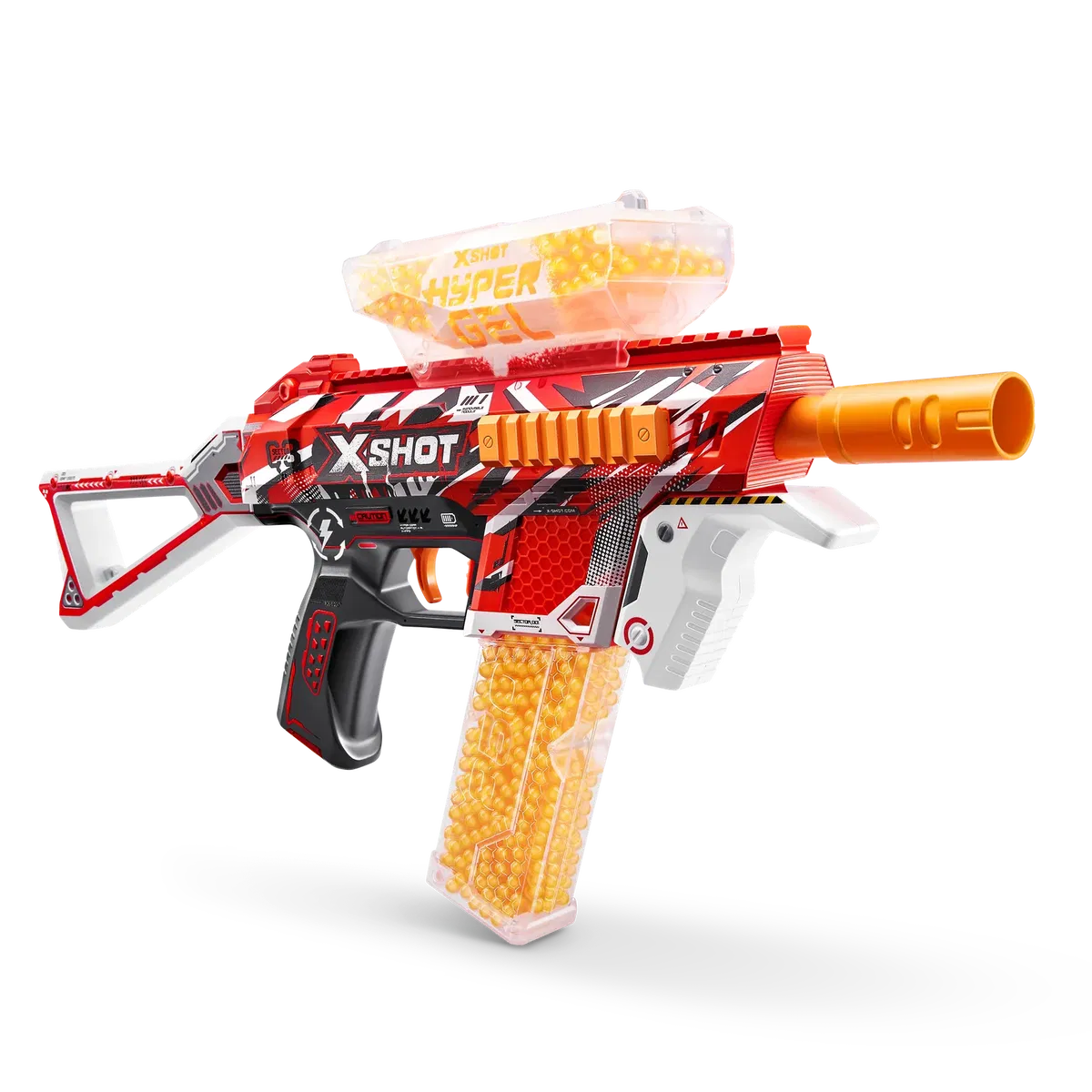 ¡Es hora de activarse con la XSHOT Hyper Gel! La pistola XSHOT Hyper Gel Trace Fire dispara bolitas de gel a 170 pies por segundo con su sistema motorizado semi- y totalmente automático. La pistola Trace Fire tiene una tolva con capacidad para 800 municiones. Cuando te quedes sin bolitas de gel simplemente voltea tu pistola para recargarla con el cargador con capacidad para 800 municiones. Esta pistola de gel motorizada viene con una batería recargable. ¡Abastecido con 10000 bolitas de gel y gafas protectoras, solo agrega agua para iniciar la mejor batalla de pistolas con bolitas de gel!
