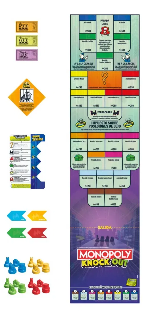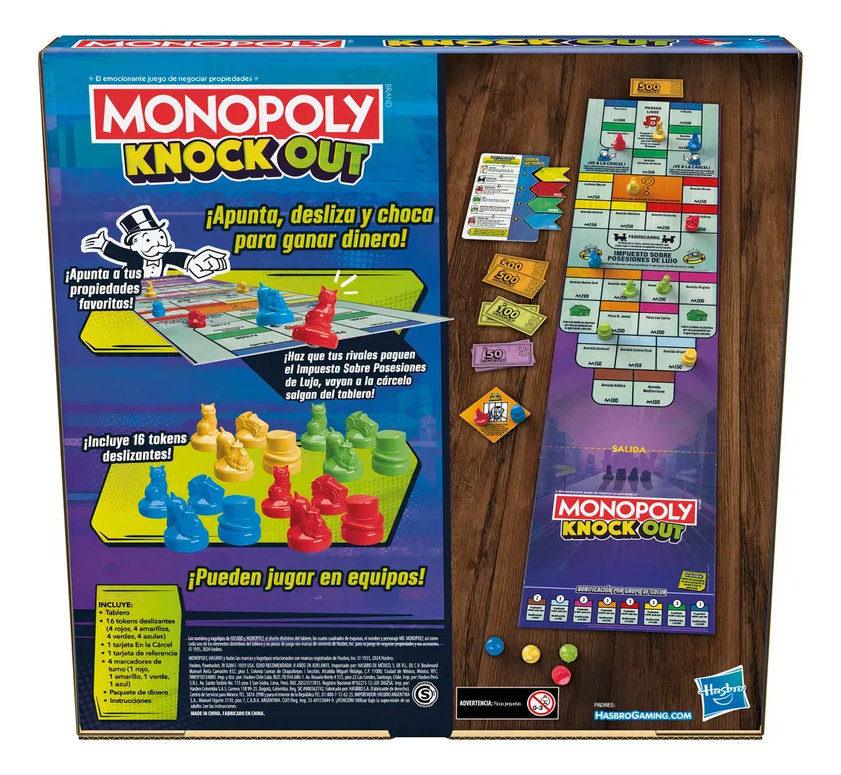 El juego Monopoly Knockout es el juego de mesa de los tokens deslizantes, en el que se gana dinero de manera divertida. En esta versión superdinámica del juego Monopoly, enfrentarás a tus oponentes en una competición de tokens. Los jugadores juegan por rondas, turnándose para deslizar sus tokens por el tablero, que mide más de 90 cm, e intentando que caigan en propiedades. Al final de cada ronda, cobrarán o pagarán dinero según el lugar donde hayan caído los tokens. Así que deben apuntar y deslizar los tokens con cuidado para caer en las mejores propiedades y enviar a otros jugadores a la cárcel o fuera del tablero. ¡Gana el jugador con más puntos al final de la partida!