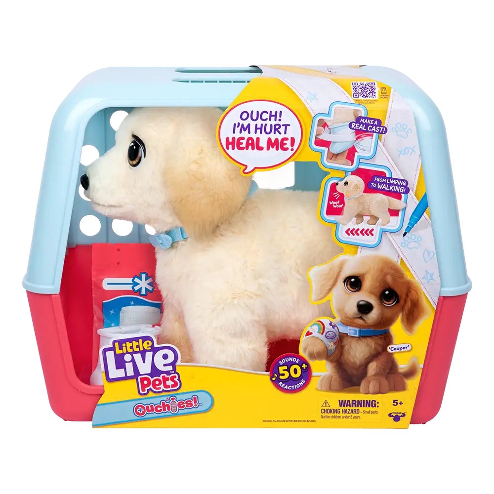 Little Live Pets Ouchies Retriever es un cachorro interactivo diseñado para brindar una experiencia de juego educativa y llena de ternura. Con más de 70 sonidos y reacciones, este perrito responde al tacto en la cabeza y la cola, mueve la cabeza y expresa cómo se siente.