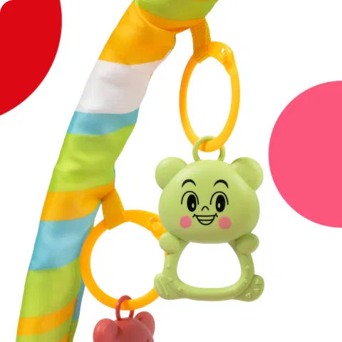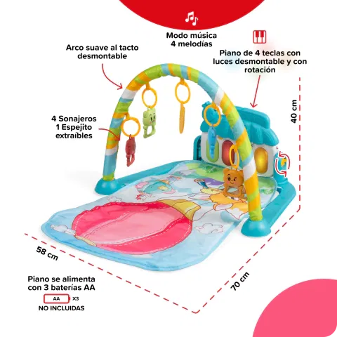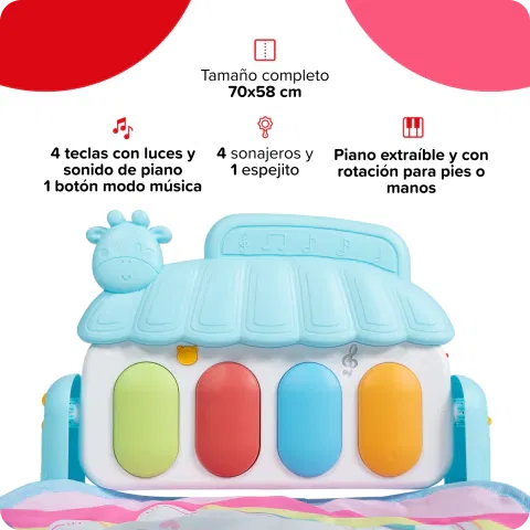 El Gimnasio Piano Bebesit es el espacio ideal para estimular los sentidos y el desarrollo motriz de tu bebé desde los primeros meses. Su diseño temático con globos, piano musical y juguetes colgantes invitan al juego y a la exploración desde el primer día.