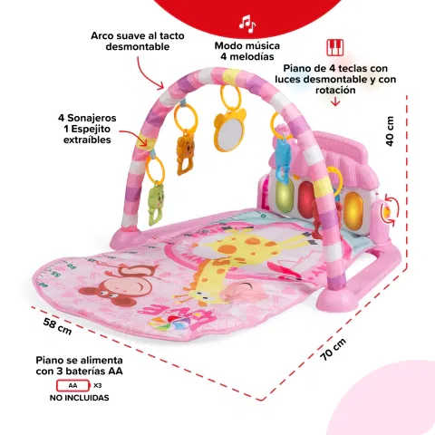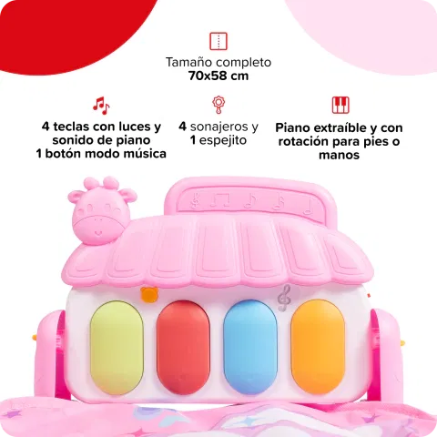 El Gimnasio Piano Bebesit invita a tu bebé a moverse, explorar y aprender mientras se divierte con luces, sonidos y adorables personajes. Su diseño con jirafa y monito, acompañado de un piano interactivo y juguetes colgantes, lo convierte en el espacio perfecto para acompañar su desarrollo.