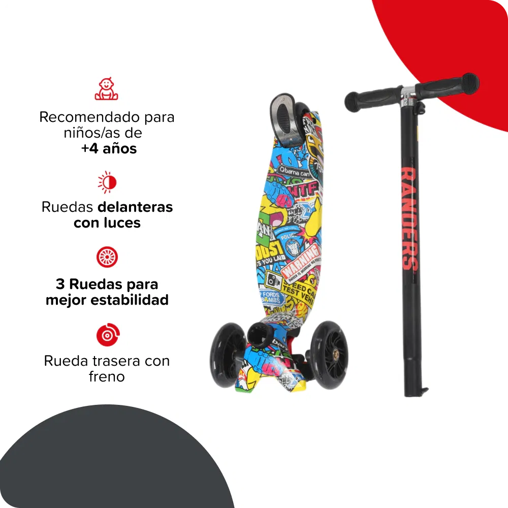 El Scooter Randers es ideal para niños que están aprendiendo a manejar, ya que su diseño de tres ruedas y freno trasero lo hace seguro y fácil de usar. Incluye luces en las ruedas, estructura liviana y sistema plegable para guardado cómodo.