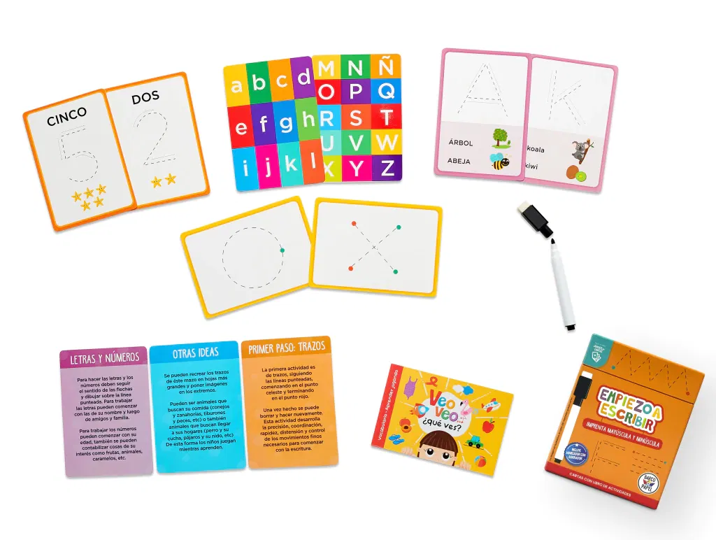 • 50 Cartas con trazos, letras, números y libro de actividades para dar los primeros pasos en la escritura.