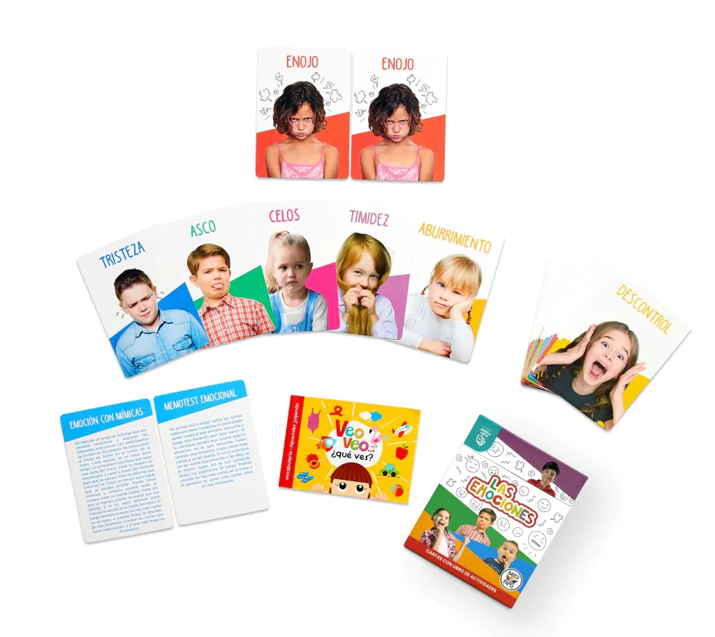 • Contiene libro de actividades y 4 tarjetas con ideas de juegos. Cada emoción está representada por imágenes reales de niños y niñas de diferentes edades.