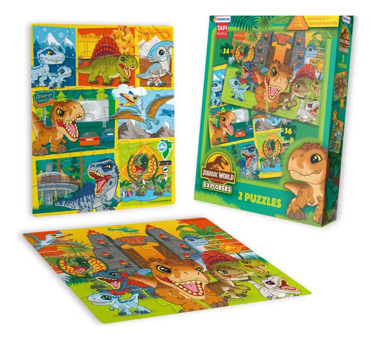 Descubre la diversión y el aprendizaje a través del emocionante set de rompecabezas '2 Puzzles Jurassic World Explorers'. Ideal para niños de 3 a 7 años, este juego de rompecabezas presenta fascinantes diseños de dinosaurios que encantarán a los pequeños exploradores. Incluye un puzzle de 24 piezas y otro de 36, promoviendo habilidades motrices y la resolución de problemas. Cada rompecabezas, con un tamaño de 16 x 20 cm, está fabricado en cartón resistente, garantizando durabilidad y estabilidad durante el juego. La línea Tapi Puzzle, creada por Tapimovil, no solo ofrece entretenimiento, sino también un momento de calidad en familia al compartir la fantástica temática de Jurassic World. Con un IVA del 21% y sin impuestos internos adicionales, es una opción accesible y segura para el desarrollo de la creatividad y el aprendizaje en los más pequeños. ¡Sumérgete en la aventura jurásica hoy mismo!