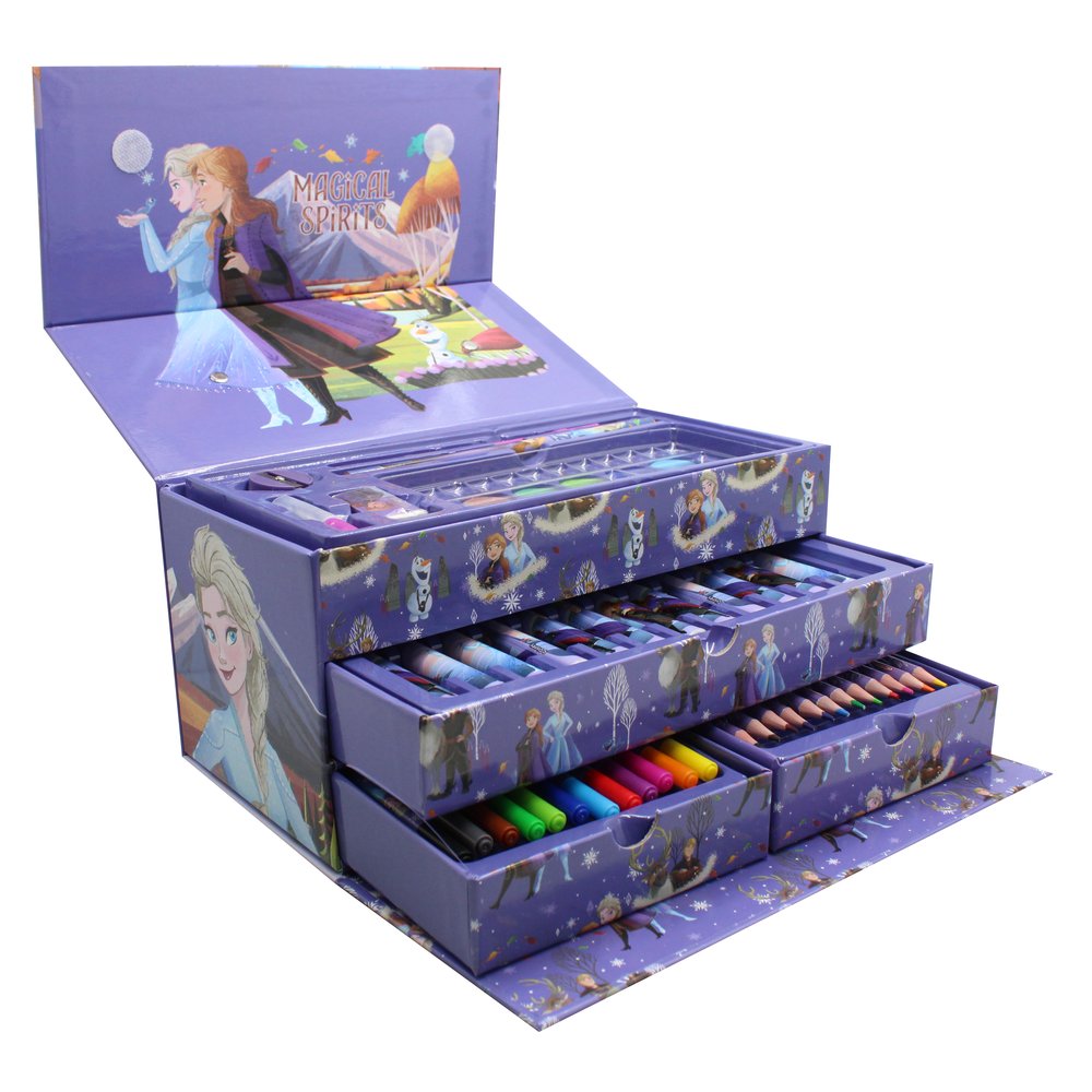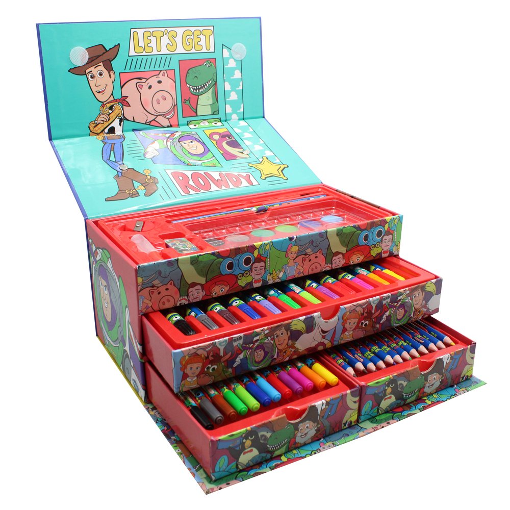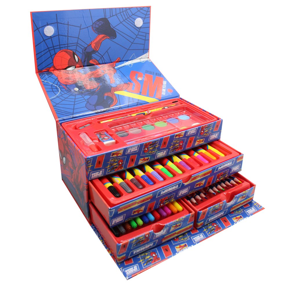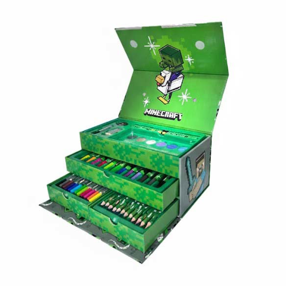 Piezas: 12 lápices de colores ; 12 mini marcadores ; 12 marcadores ; 12 acuarelas ; 1 sacapuntas ; 1 borrador (goma de borrar) ; 1 lapiz ; 1 pincel ; 1 adhesivo