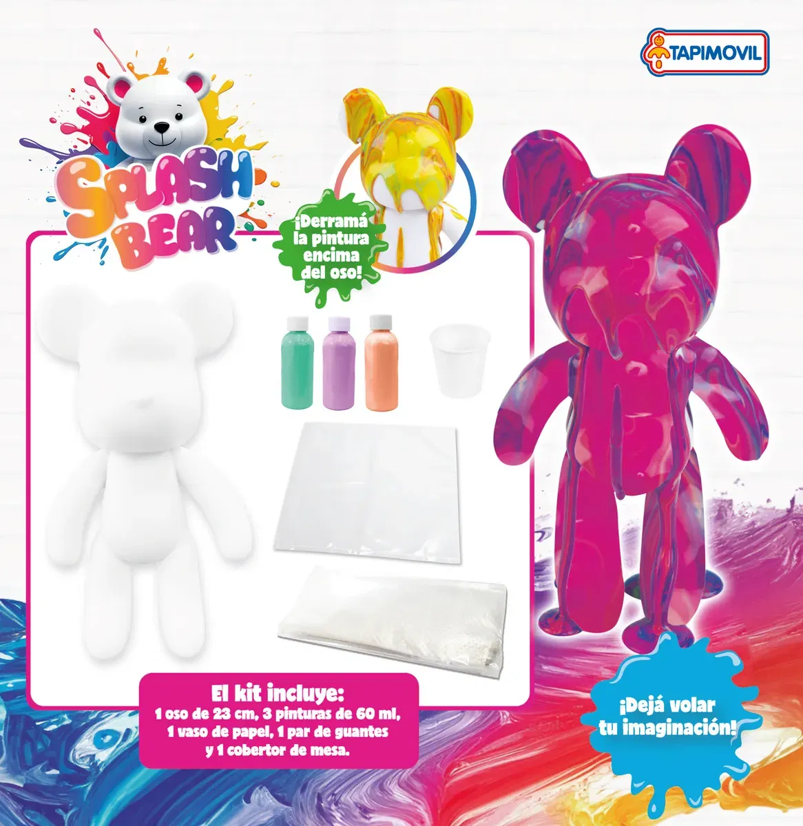 ¡SPLASH BEAR! El Oso de Arte más Famoso de TikTok -Tapimovil- ¡Desata tu creatividad y sé el artista que hay en vos con el increíble SPLASH BEAR! Este es el kit creativo viral que está revolucionando TikTok. ¡No aceptes imitaciones! Este es el producto original traído a Argentina por Tapimovil. ¿Qué es SPLASH BEAR? Es un set innovador que te permite crear tu propia obra de arte con un oso coleccionable, utilizando la técnica de "pour painting" (pintura vertida). Mezclá, derramá y creá combinaciones de colores únicas e irrepetibles. ¡Cada oso será una pieza de arte exclusiva! Lo que Recibirás en tu Kit: Oso de 25 cm: El lienzo perfecto para tu creación. Su tamaño es ideal para exhibir. 3 Pinturas de Colores: Para empezar a mezclar y derramar al oso. Vaso: Herramienta esencial para la mezcla de pintura. Cobertor de Mesa: Para mantener tu espacio de trabajo limpio. Un Par de Guantes: Para que te concentres en crear sin ensuciarte. Características y Dimensiones: Tamaño de la Caja/Set: 25 cm x 25,5 cm x 7,8 cm. ¡Mostrá el artista que hay en vos!