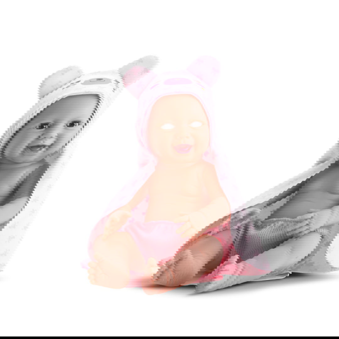 Bebes Divertoys. Llego la hora de bañarse, coloca el duchador en un vaso de agua y ¡largara agua!. Incluye toalla de baño y esponja en forma de corazon. Medida aproximada: 30, 5 cm de altura Edad recomendada: + 3 años.