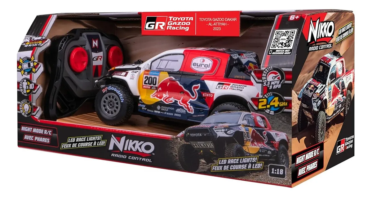 Nikko Toyota Gazoo Racing Dakar 2023 Winner 1:18 Art.10591 El controlador del Toyota Gazoo Rally Racer está equipado con una tecnología de transmisión de 2,4 GHz, que ofrece diversión sin interferencias de hasta 40 m de alcance y permite hasta 10 jugadores a la vez. El Toyota Gazoo Dakar Nasser Al-Attiyah a escala 1:18 trae fantásticos detalles auténticos del original y muy divertido para los pequeños corredores y aficionados al automovilismo.